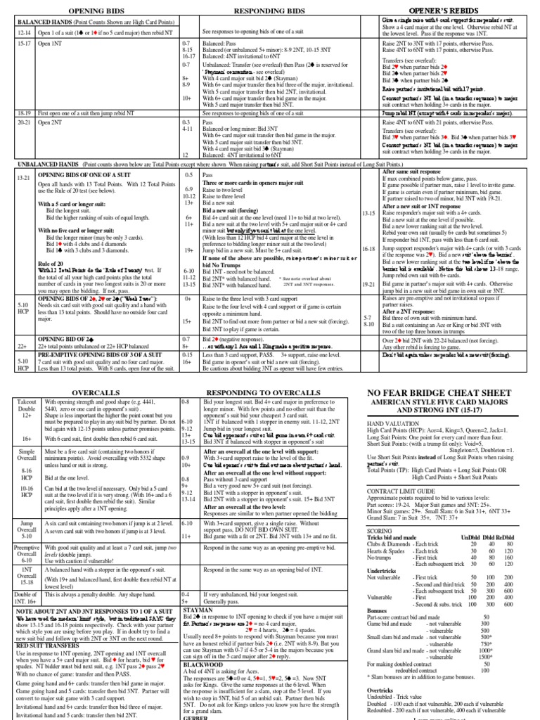 Bridge Bidding Cheat Sheet Plain Trick Games Games Of Mental Skill